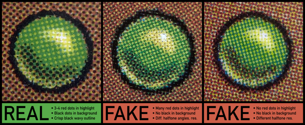 - Green Dot Test und Druckmuster: Eine gute Lupe oder ein Mikroskop ist hilfreich. Echte Magic Karten zeigen unter Vergrößerung ein spezifisches Druckmuster mit klaren Punkten, während Fälschungen oft ein unscharfes Muster haben. Insbesondere der sogenannte „Green dot Test“ kann hierbei mit einer Lupe oder Mikroskop durchgeführt werden und Klarheit geben. Nachfolgend ist ein Beispiel aus einem guten Artikel hierzu. Bei einer originalen Magic Karte lässt sich auf der Rückseite im grünen Punkt in gelblicher Fleck erkennen. In diesem gelben Fleck befinden sich vier rote Punkte, die eine L-Form bilden. Zudem ist der grüne Punkt von einem intensiven schwarzen Kreis umgeben.